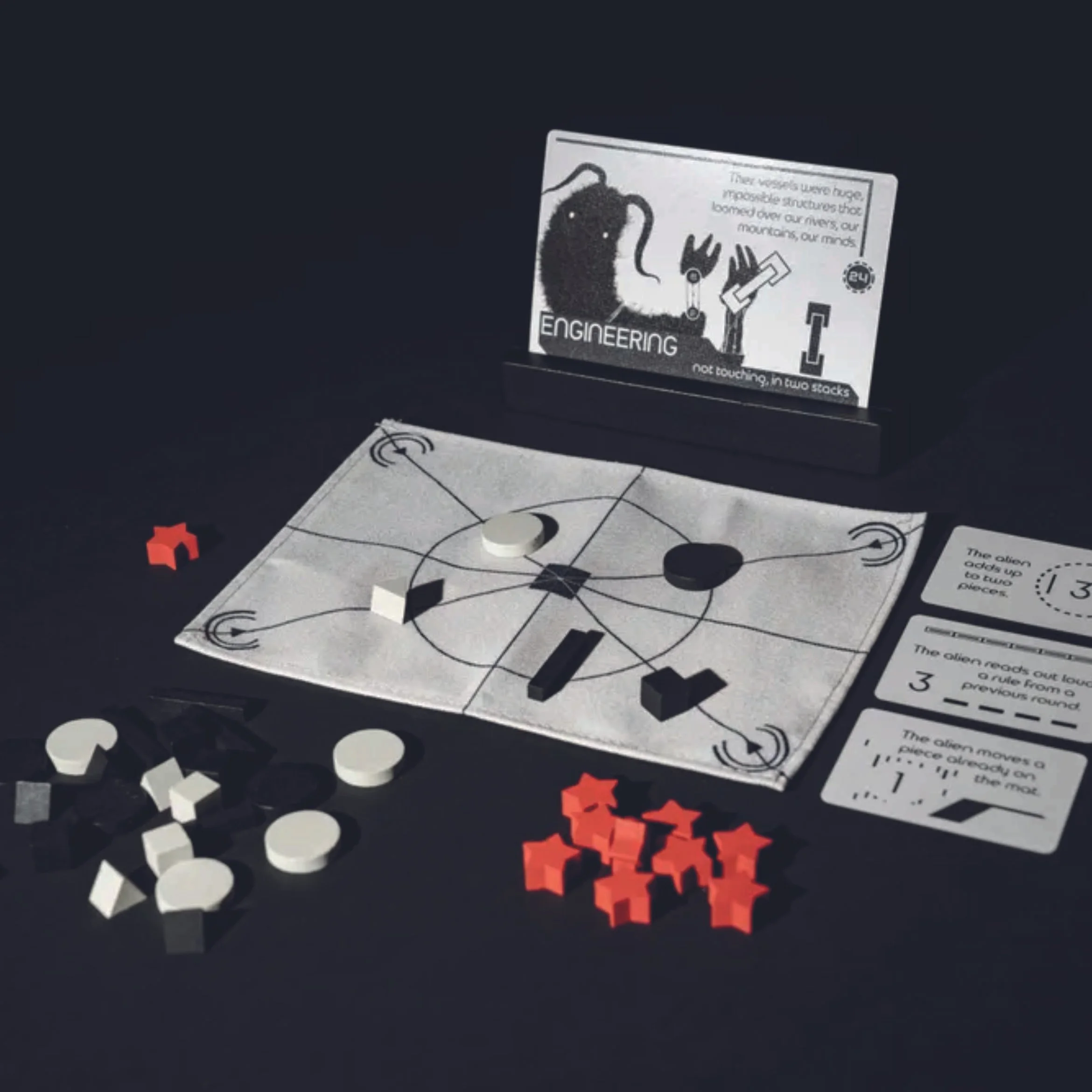 On a turn, the Experts arrange black and white pieces on a mat, discussing and debating how and what to send. Once finished, the Alien then replies by using pre-set rules only they can see to add, remove, and adjust the signal. The Experts try to guess the pre-set rules to win cooperatively with the Alien.