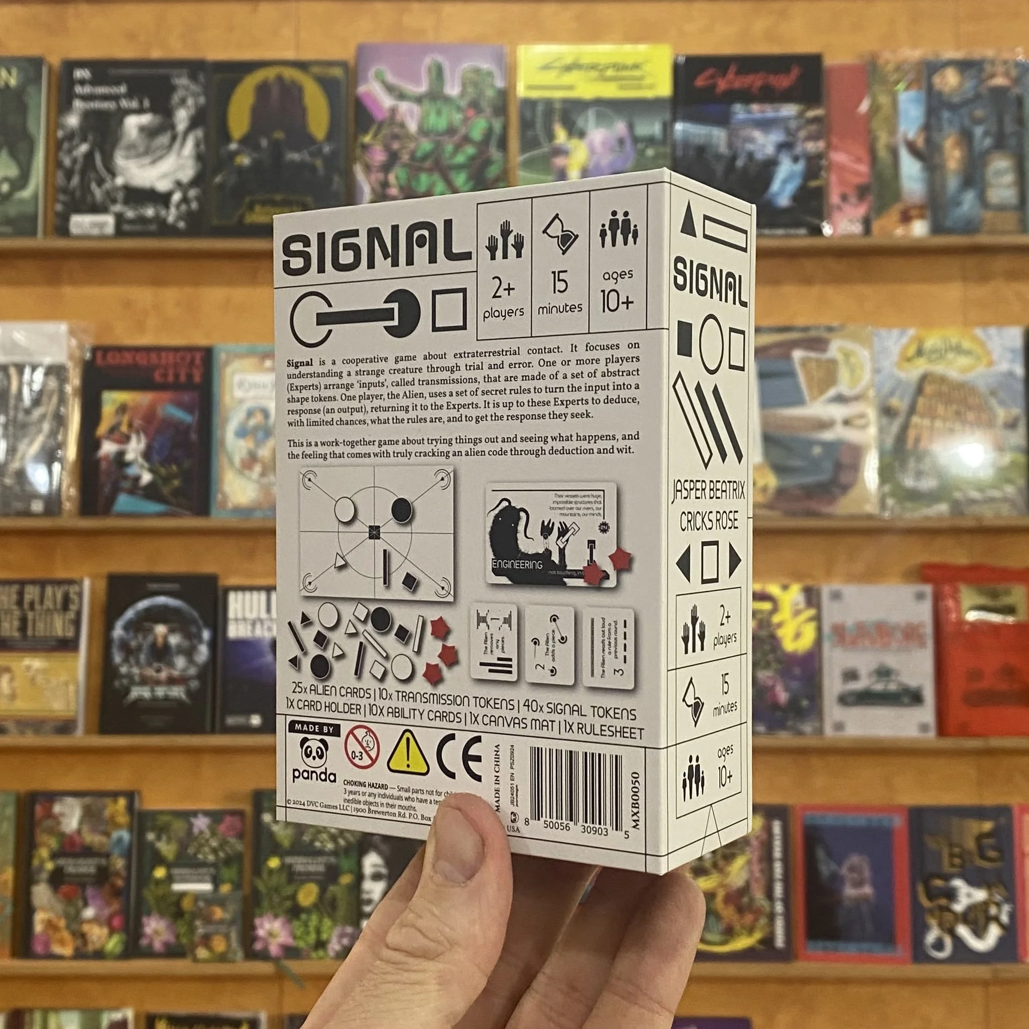 Players take on the roles of Experts seeking to understand the Alien player, who is seeking to be understood. The Experts will create and transmit ‘signals’ to the Alien, who has certain rules for how to respond that must be deduced by the Experts.