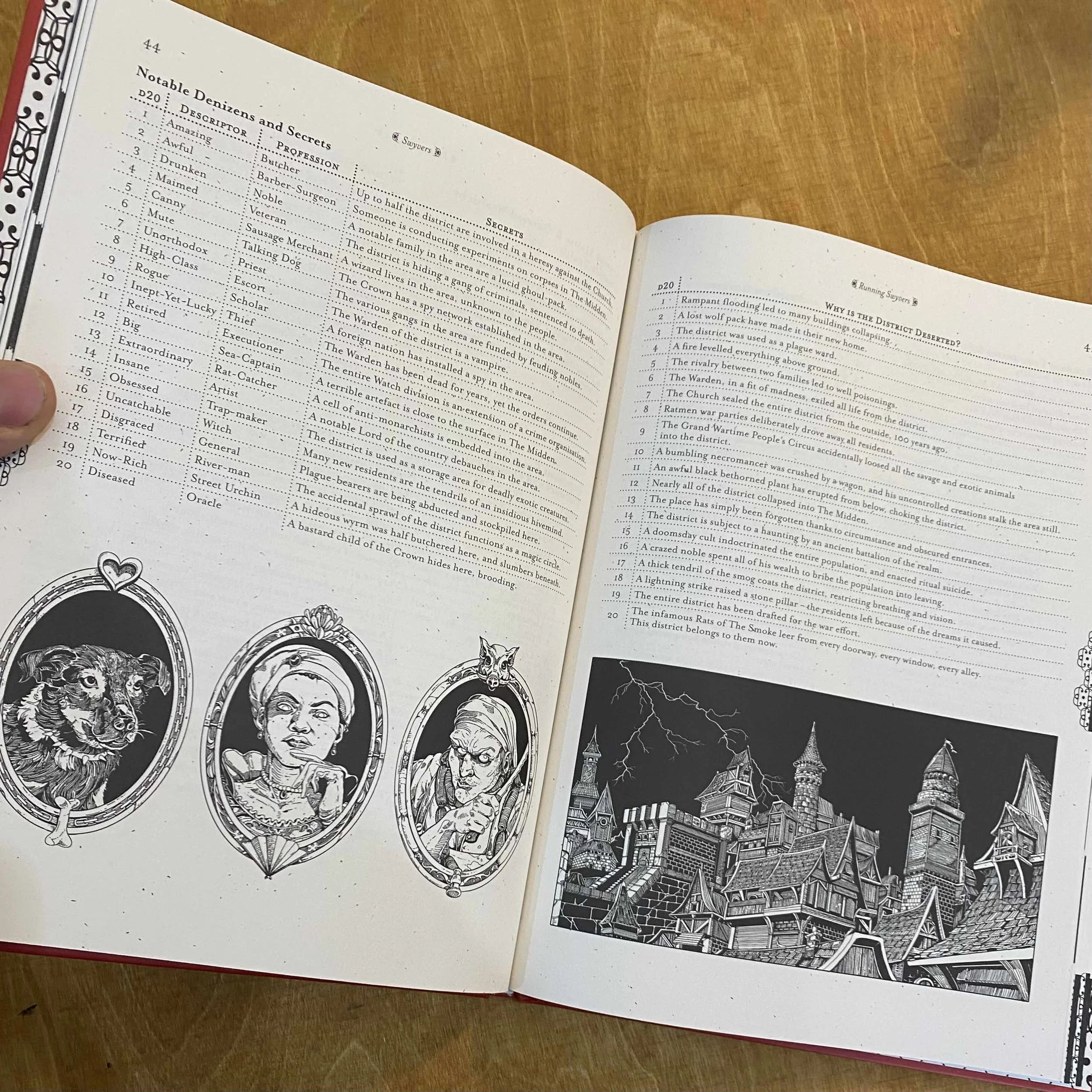 Every group of Swyvers will have their very own Smoke. The GM starts a campaign by generating the city, starting from a core of districts: the Royal Gaol, the Palace, the Mayoral District and the Docks. From there they follow along Swyvers' generation tables to flesh out and, potentially, endlessly expand their rotten city.